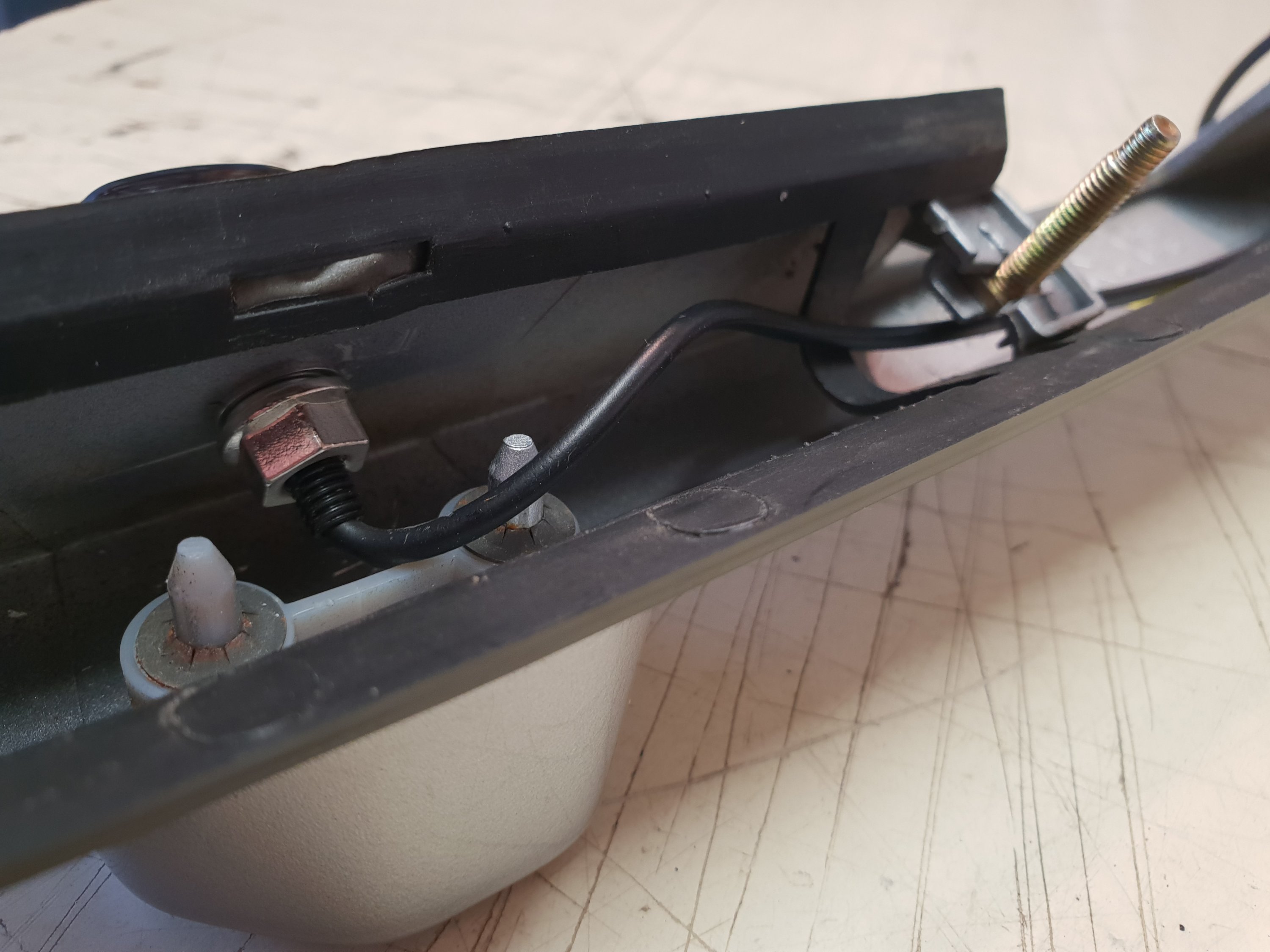 The number plate light moulding is held in place by 4 nuts which are easily accessible from under the boot lid once the fibre inner cover is removed. I drilled a hole beside one of the fixing screws so it would be easy to thread through and to reach from the inside.