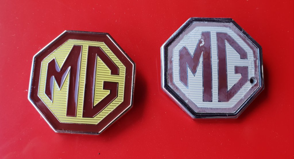 The original font and rear MG logo badges were badly faded so I bought replacements. The rear badge is a replacement and old one needs to be removed. If you force a knife into the edge then you risk damaging the surround. The recommended method is to drill a small hole into the badge and screw in a screw to force the old badge out.