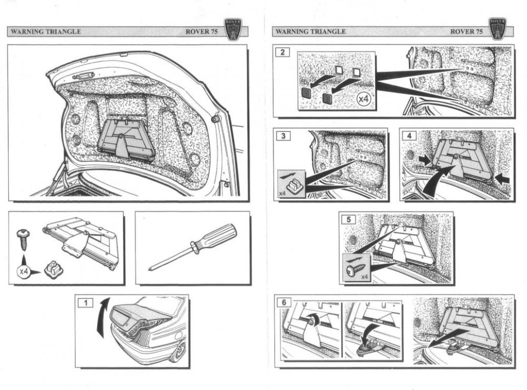 Seems a good idea to have the warning triangle easily accessable if required in an emergency. This is an official MG Rover accessory which apparently is copied in other German cars of the same era – bearing in mind that MG Rover as such was previously owned by bmw. So if you can’t find a genuine MG Rover fitting the VW Bora is identical. I have found a copy of the installation instructions ready for when I get hold of one.