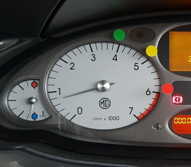 Not suggesting that everyone should do this but it works for me. I have placed 3 colour coded stickers beside my rev counter to indicate 3 points of engine performance.