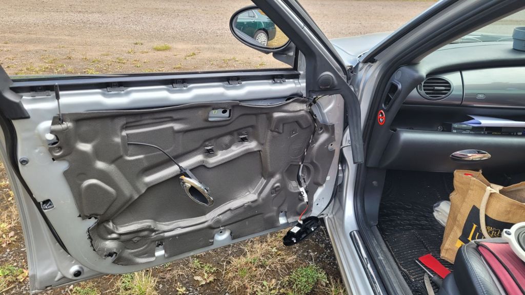 I leant the knack to remove the door cards …… once 2 screws are removed, the plastic studs pulled out from the bottom and sides of the door card and window switch removed. Carefully loosen the door handle cup with surround – do not try to remove the surround on its own – it must be loosened with the cup. Then grab the main door grab handle and yank upwards firmly …… not outwards. It may take a couple of attempts. Then with pliers remove two plastic caps from the 2 large pins in the centre of the door using pliers to release and replace them on the door card.