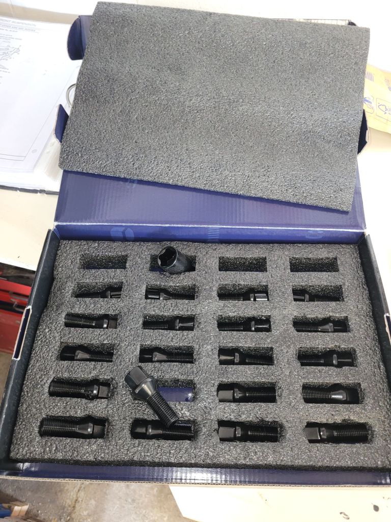 I fitted the black enamelled wheel bolts I got for Christmas. A pretty straight forward job by removing one bolt at a time not forgetting to retorque the new ones to 125Nm.